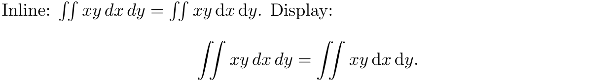When typesetting an integral, the integrand and the differential should always be separated by a thin space, as should each differential in an iterated integral. (See §3.3 for more on spaces.) Some people prefer to typeset the differential symbol d as a roman (upright) symbol, but this is a matter of taste. Whichever variant you choose, it’s a good idea to define a macro for denoting the differential: